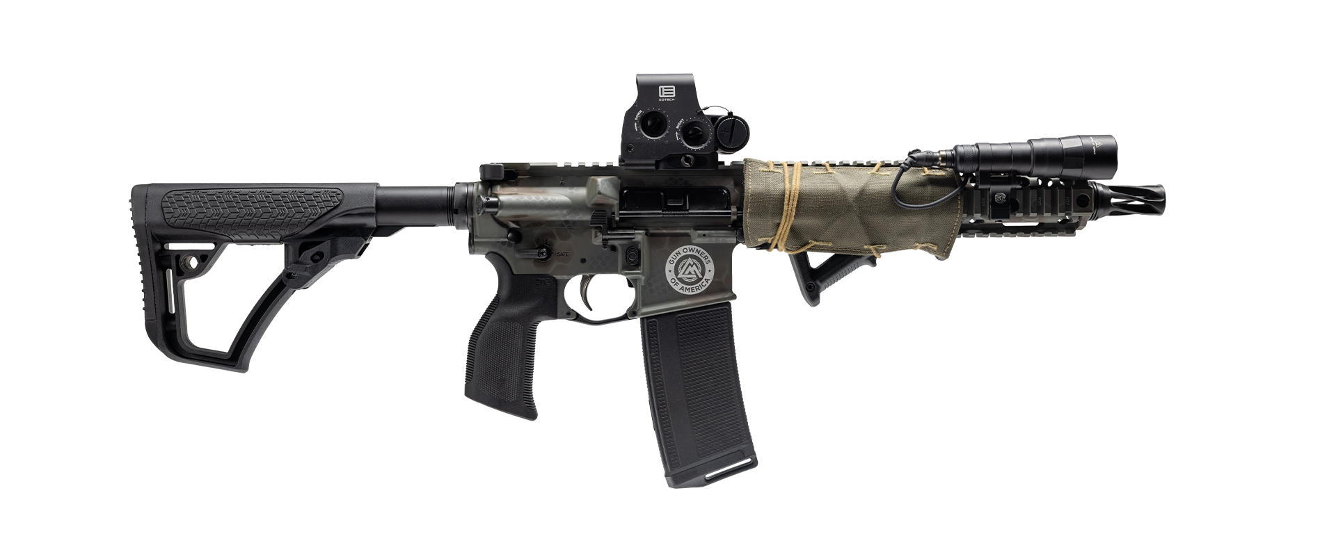 At its core, this Signature Series features a RISII MK18 upper on a DD4 lower, finished in a bold, custom Rattlecan Woodland Cerakote. It’s built to run hard and look like it means it. This build is a full-spectrum freedom kit—from optic to muzzle. It’s backed by Daniel Defense’s legendary build quality, guided by Clint’s warrior ethos, and tied to the mission of Gun Owners of America. Built to perform. Built to last. Built to stand for something.